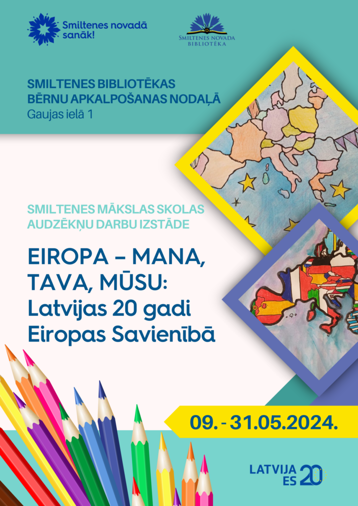 2004.gada 1.maijā Latvija iestājās Eiropas Savienībā. Atzīmējot šo notikumu, Smiltenes bibliotēkas Bērnu apkalpošanas nodaļā apskatāma divdesmit septiņu Smiltenes Mākslas skolas audzēkņu darbu izstāde “Eiropa – mana, tava, mūsu”, kas veltīta Latvijas 20 gadiem Eiropas Savienībā.