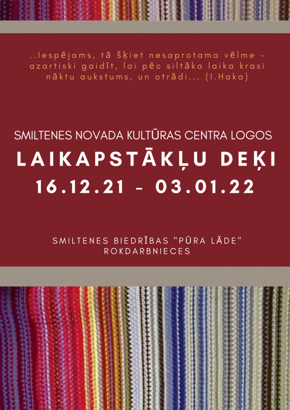 Smiltenes novada kultūras centra logos no 16.decembra – 3.janvārim būs skatāma Smiltenes biedrības “Pūra lāde” rokdarbnieču izstāde “Laikapstākļu deķi”.