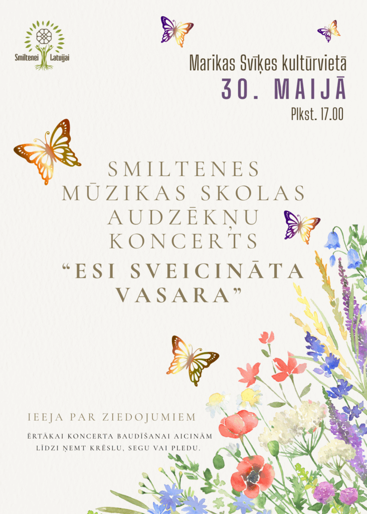 30.maijā plkst. 17.00 Marikas Svīķes kultūrvietā Smiltenes Mūzikas skolas audzēkņi ieskandinās Veco parku koncertprogrammā “Esi sveicināta vasara”.