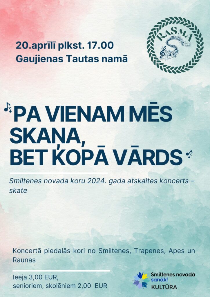 Smiltenes novada koru koncerts “Pa vienam mēs skaņa, bet kopā vārds” Piedalās: Smiltenes , Raunas, Apes un Trapenes kori. Ieejas maksa uz koncertu 3,00 EUR, senioriem, skolēniem 2,00 EUR