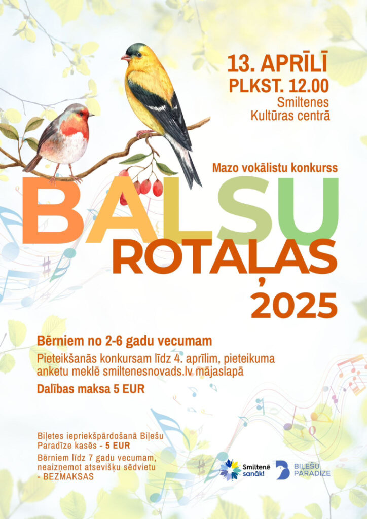 13. aprīlī plkst. 12.00 Smiltenes Kultūras centrā norisināsies mazo vokālistu konkurss „Balsu rotaļas”. Tajā aicināti piedalīties Smiltenes novada vokālisti līdz 6 gadu vecumam (ieskaitot).