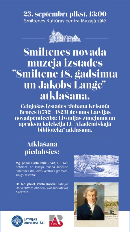 23.septembrī plkst. 13.00 Smiltenes Kultūras centra Mazajā zālē Smiltenes novada muzeja izstādes “Smiltene 18. gadsimtā un Jakobs Lange” atklāšana.