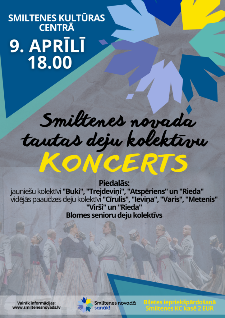 9.aprīlī pulksten 18.00 Smiltenes kultūras centra lielajā zālē norisināsies Smiltenes novada tautas deju kolektīvu koncerts. Demonstrējot savu meistarību un līdz šim paveikto, dejas no 2023. gada Deju svētku repertuāra tajā atrādīs 12 kolektīvi.