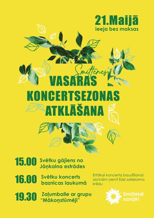 Pēc koncerta plkst. 19.30 vasaras sezonas pirmā zaļumballe kopā ar grupu “Mākoņstūmēji” un DJ Demyjan. Ieeja koncertā un ballē ir bezmaksas.