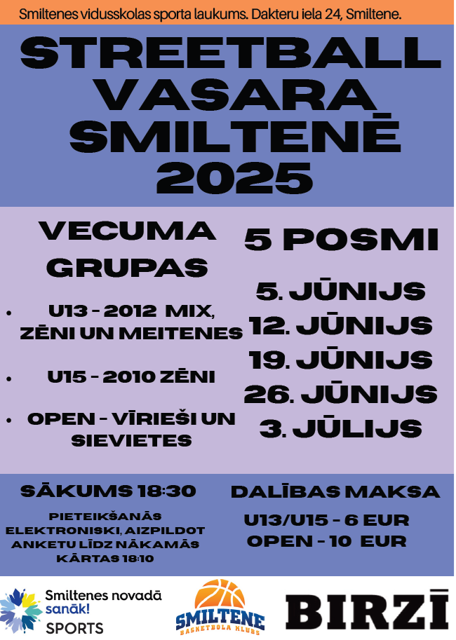 Aicinām visus basketbola entuziastus – lielus un mazus – piedalīties ielu basketbola turnīrā “Streetball vasara Smiltenē 2025”, kas notiks Smiltenes vidusskolas sporta laukumā (Dakteru ielā 24)! Vasaras siltie vakari, draudzīga konkurence un lielisks noskaņojums garantēts!