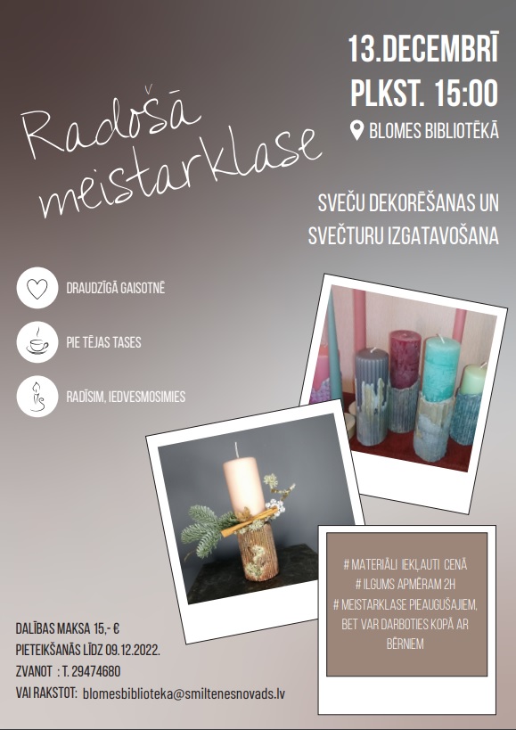 Blomes bibliotēka aicina 13.decembra pēcpusdienā no plkst. 15.00 pieaugušos un vecākus ar bērniem piedalīties radošajā darbnīcā.