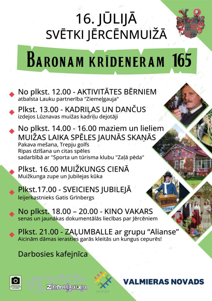 16.jūlijā Jērcēnmuižā aicinām svinēt barona Krīdenera 165. jubileju. Lai arī plecos ievērojama gadu nasta, svētkos varēs satikt arī pašu baronlielskungu. Varbūt viņš pastāstīs kādu medību piedzīvojumu vai vienkārši kādu joku. Kā tas iespējams, tas lai paliek noslēpumā.