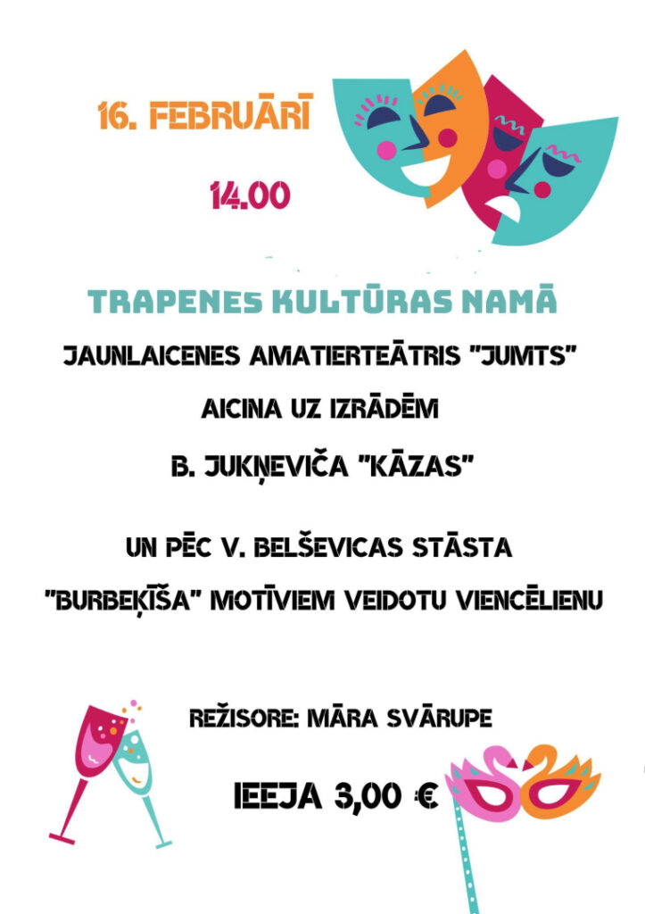 16.02.2025. plkst. 14:00 Trapenes Kultūras namā viesosies Jaunlaicenes amatierteātris “Jumts” (režisore Māra Svārupe) ar viencēlienu izrādēm B. Juhņēviča “Kāzas” un pēc V. Belševicas stāsta “Burbeķīša” motīviem veidotu viencēlienu.