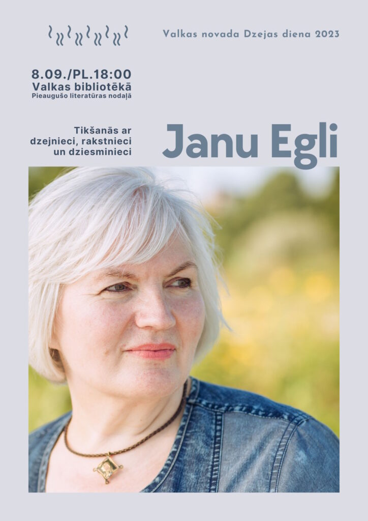 Turpinot Dzejas dienas tradīcijas Valkas novadā, piektdien, 8. septembrī plkst. 18:00 Valkas bibliotēkā viesosies dzejniece, rakstniece un dziesminiece Jana Egle.