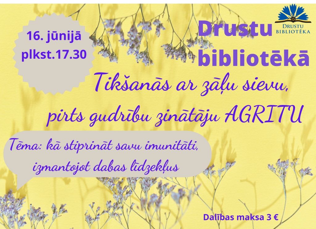 Drustu bibliotēka ceturtdien, 16. jūnijā, plkst. 17.30 aicina uz tikšanos ar zāļu sievu, farmaceiti, pirts gudrību zinātāju Agritu.