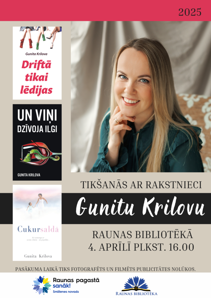 Š.g. 4. aprīlī plkst. 16.00 Raunas bibliotēkā notiks tikšanās ar rakstnieci Gunitu Krilovu. Laipni gaidīti visi interesenti!