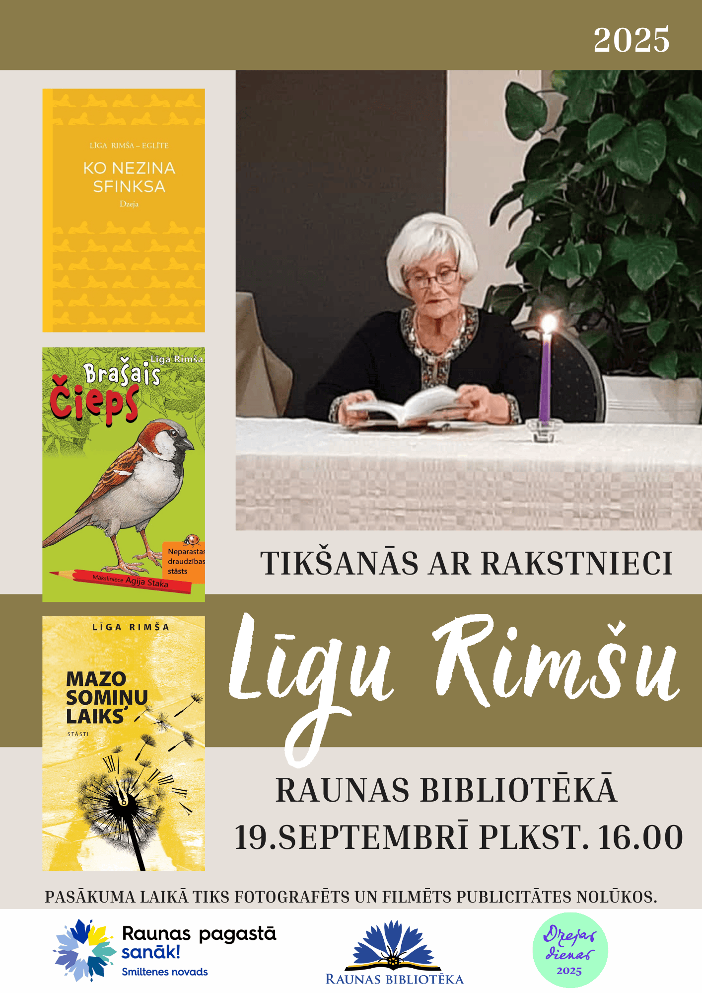 Š.g. 19. septembrī plkst. 16.00 Raunas bibliotēkā notiks tikšanās ar dzejnieci un rakstnieci Līgu Rimšu. Viņa raksta dzeju un stāstus, kā arī stāstus bērniem. Šobrīd top pirmais romāns.