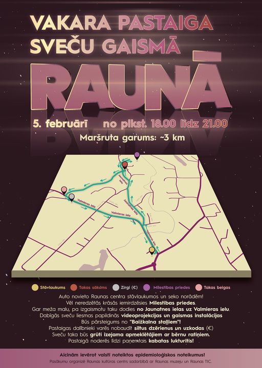 5.februārī aicinām ikvienu doties “Vakara pastaigā sveču gaismā Raunā”. Sveču taka mirdzēs no plkst.18.00 līdz plkst. 21.00 un kopējais maršruta garums būs apmēram 3 km.