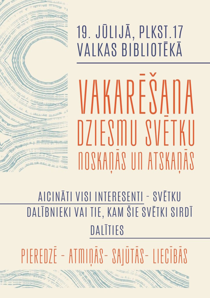 Uzsverot Latvijas vērienīgākā kultūras notikuma – Vispārējo latviešu Dziesmu un Deju svētku – nozīmīgumu, 19. jūlijā, plkst.17 Valkas bibliotēka visus interesentus – svētku dalībniekus un tos, kam šie svētki ir sirdī – aicina uz pasākumu “Vakarēšana Dziesmu svētku noskaņās un atskaņās”.