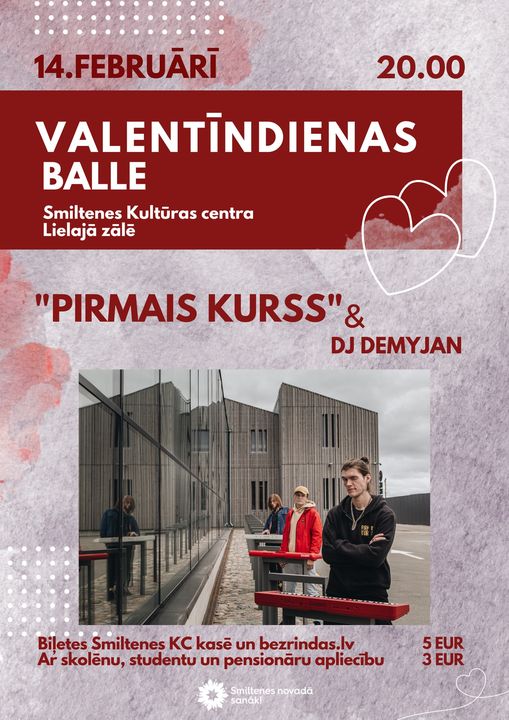 Smiltenieši un Smiltenes viesi, jā, jūs, kuriem sirds Valentīndienas jūtīs jau pukst straujāk, otdienas, 14. februāra vakarā savu sirdsāķīti vediet uz randiņu mūsu Kultūras centrā! Tie no jums, kuri otro pusīti vēl meklējat – grupas “Pirmais kurss” nebēdnīgās dziesmas un DJ demyjan izvēlētie deju ritmi sola traku danču un patīkamu iepazīšanos vakaru! Priecīgu jums Valentīndienu!