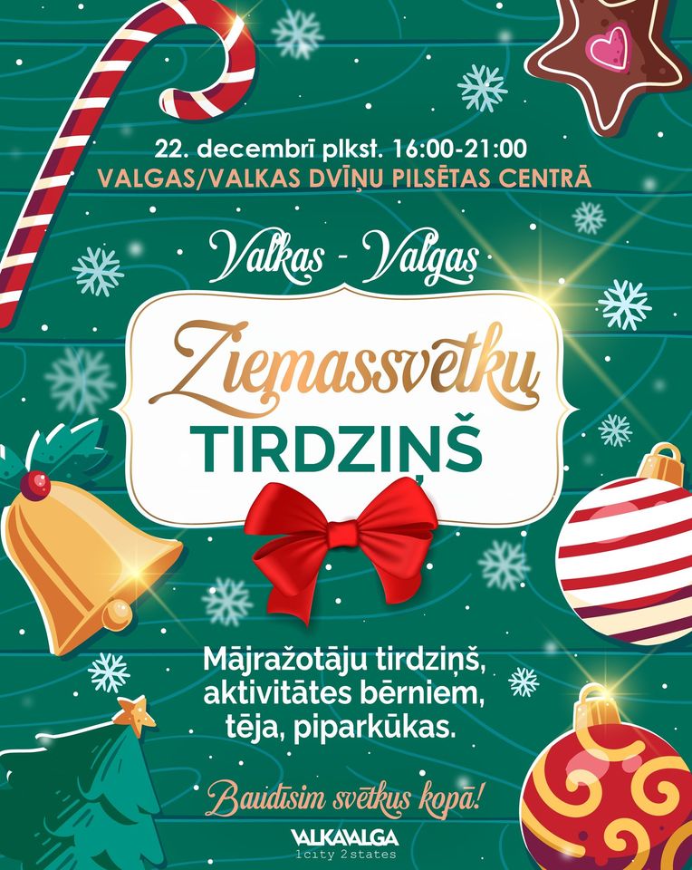 22. decembrī no 16:00 līdz 21:00 Valgas- Valkas Dvīņu pilsētas centrā norisināsies ikgadējais Ziemassvētku mājražotāju tirdziņš.