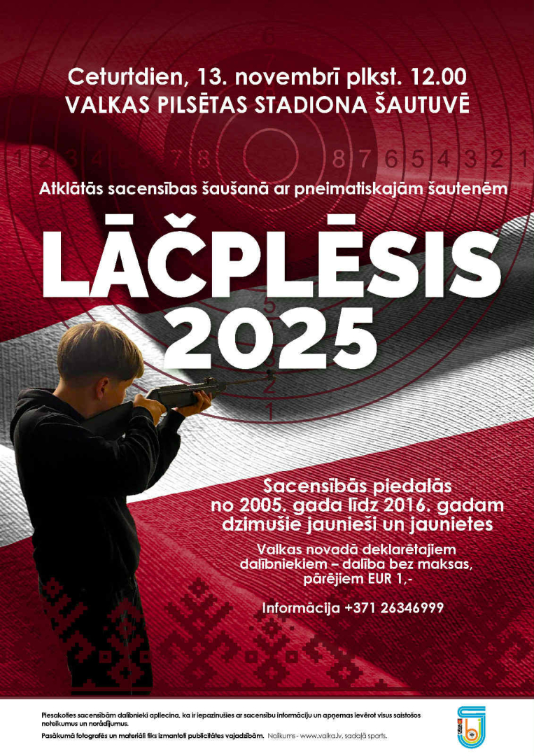 Ceturtdien, 13. novembrī, plkst. 12.00 Valkas pilsētas stadiona šautuvē norisināsies atklātās sacensības šaušanā ar pneimatiskajām šautenēm “Lāčplēsis 2025”.