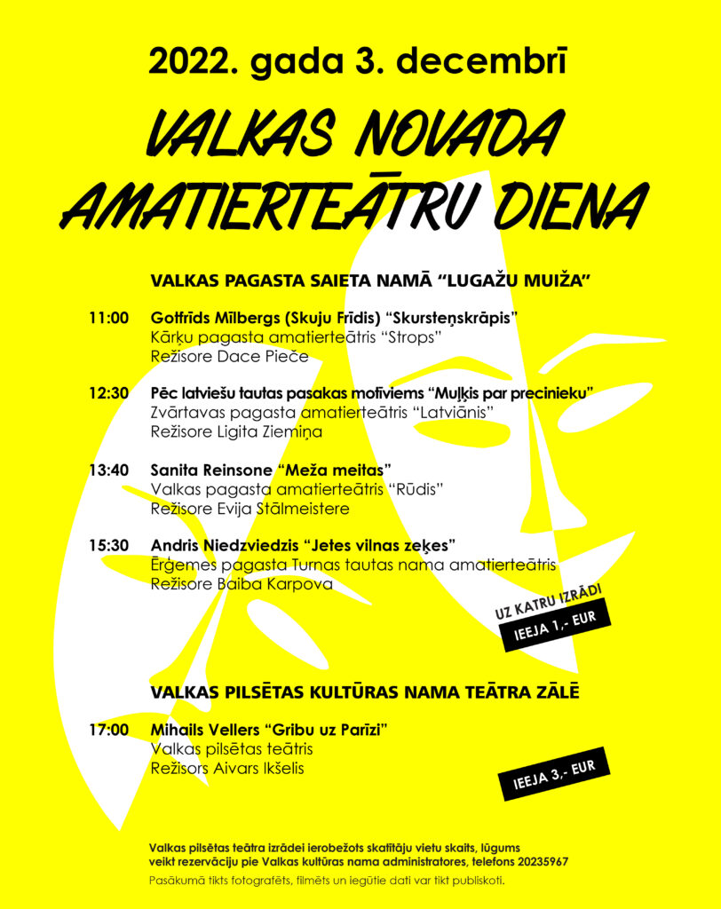 Sestdien, 3. decembrī Valkas pagasta Saieta namā “Lugažu muiža” un Valkas pilsētas kultūras namā notiks Valkas novada amatierteātru diena – skate, kurā varēs noskatīties 5 iestudējumus.