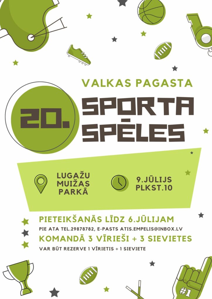 Pēc gada pārtraukuma, šogad 9. jūlijā pl.10.00 “Lugažu muižas” parkā notiks jau divdesmitās Valkas pagasta sporta spēles. Organizatori neplāno izmaiņas tradicionālajos noteikumos, kā vienmēr, dalībai spēlēs tiek aicinātas pieteikties komandas, kuru sastāvā, kā minimums, ir 3 vīrieši un 3 sievietes (rezervisti 1+1). Aicināti savu dalību pieteikt, pirmkārt Valkas pagasta iedzīvotāji, bet priecāsimies arī par komandām, kuras pārstāv kaimiņu pagastus un Valku.