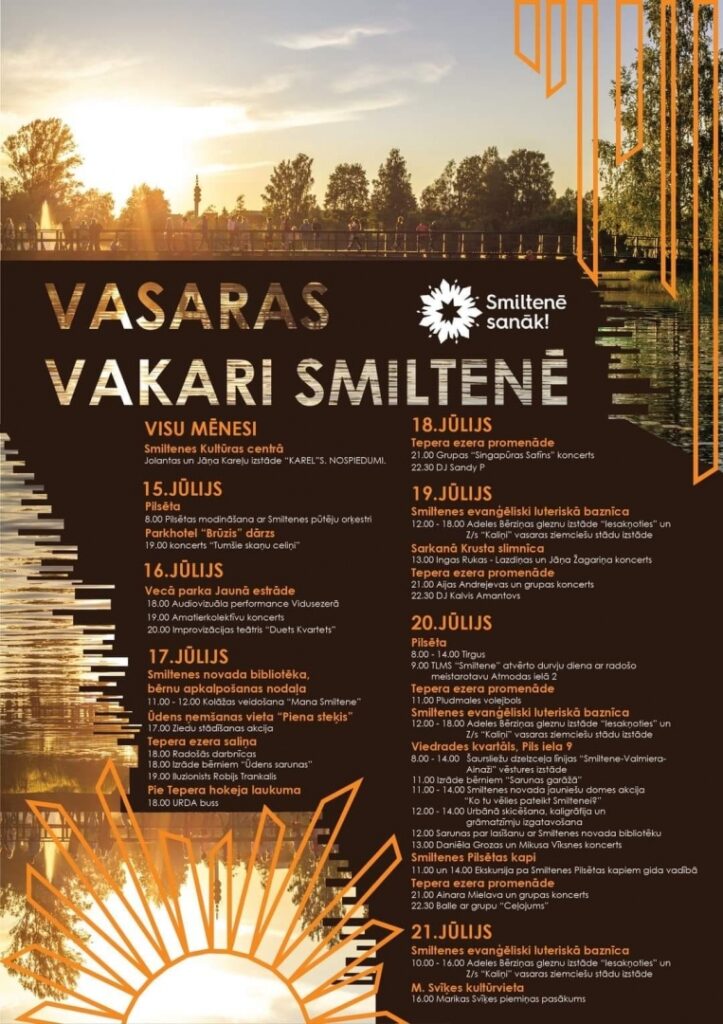 Nāciet un piedalieties Vasaras vakaros Smiltenē, kur Jūs gaida dažādi kultūras, mākslas un izklaides pasākumi visai ģimenei. Baudiet vasaru ar mūziku, izstādēm, sporta aktivitātēm un daudz ko citu. Smiltenē sanāk!