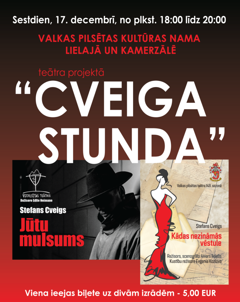 Sestdien, 17. decembrī no plkst. 18.00 līdz 20.00 Valkas pilsētas kultūras namā (Emīla Dārziņa ielā 8, Valkā) Vecpilsētas Teātra un Valkas pilsētas teātra kopprojekta “Cveiga stunda” izrādes – pēc Stefans Cveigs “Jūtu mulsums” stāsta un “Kādas nezināmās vēstule” noveles motīviem, aicina Valkas pilsētas teātris.