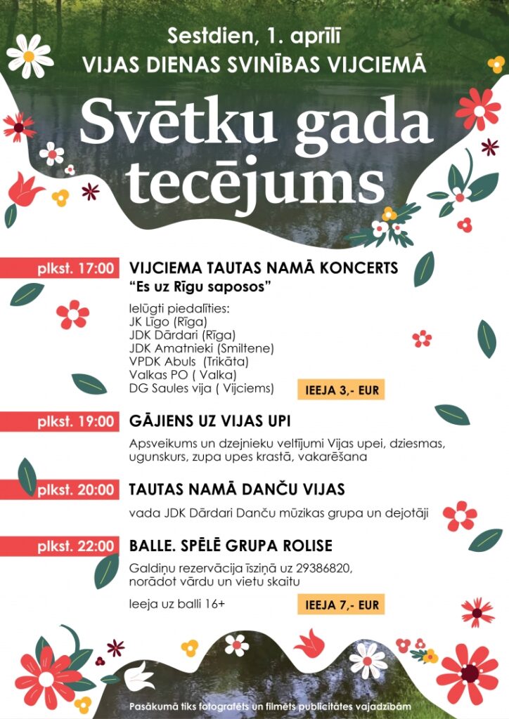 Plkst. 17:00 tautas namā būs koncerts, kur atbilstoši vārdam Vija, tiks vītas dziesmu un deju vijas ar moto “Ceļā uz dziesmu svētkiem – svētku gada tecējums”. Koncertā piedalīsies kolektīvi, kas ir pamats dziesmu svētkiem – dejotāji, dziedātāji un orķestris. Ielūgti piedalīties ir koris “Līgo” no Rīgas, jauniešu deju kolektīvs “Dārdari” no Rīgas, jauniešu deju kolektīvs “Amatnieki” no Smiltenes, vidējās paaudzes deju kolektīvs “Abuls” no Trikātas, deju grupa “Saules vija” no Vijciema, kā arī Valkas pūtēju orķestris.