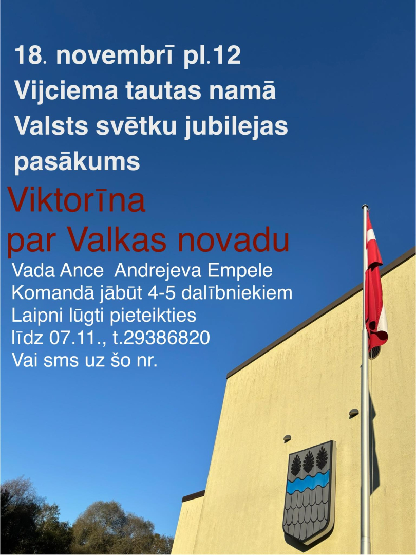 18. novembrī plkst. 12.00 Vijciema tautas namā notiks Valsts svētku jubilejas pasākums, kura ietvaros dalībniekiem būs iespēja piedalīties aizraujošā viktorīnā par Valkas novadu.