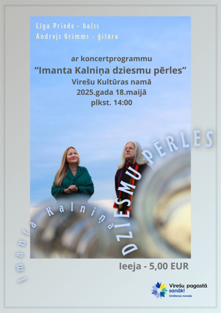 18.05.2025. plkst. 14:00 – Līga Priede un Andrejs Grimms aicina uz koncertprogrammu “Imanta Kalniņa Dziesmu Pērles” Ieeja – 5.00 EUR