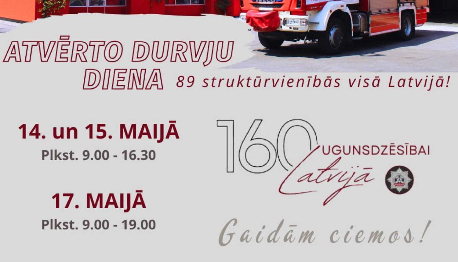 17.maijā laika posmā no 9.00 līdz 19.00 ikviens interesents aicināts uz Valsts ugunsdzēsības un glābšanas dienesta Atvērto durvju dienu!
