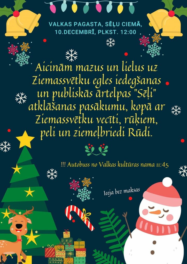 10.decembrī, plkst. 12.00 aicināti mazi un lieli uz Ziemassvētku egles iedegšanas un publiskās ārtelpas “Sēļi” atklāšanas pasākumu, kopā ar Ziemassvētku vecīti, rūķiem, peli un ziemeļbriedi Rūdi.
