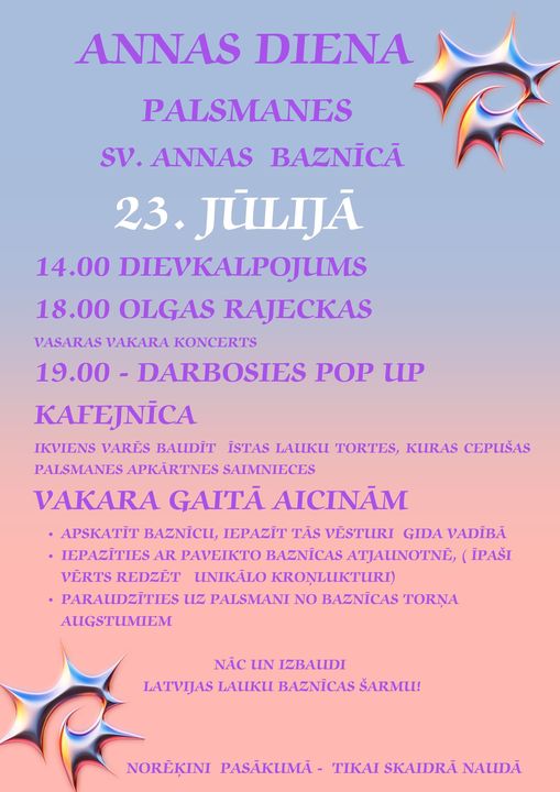 Tāpēc 23. jūlijā ikviens gaidīts Palsmanes sv. Annas baznīcā, lai kopīgi svinētu šo dienu. Baudīsim mākslinieces Olgas Rajeckas koncertu. Pop Up kafejnīcā cienāsimies ar Palsmanes apkārtnes saimnieču ceptām tortēm un kūkām. Interesentiem būs iespēja uzzināt Palsmanes baznīcas vēsturi un paveikto baznīcas atjaunotnē.