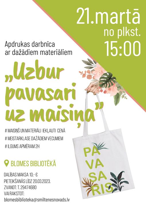 BLOMES BIBLIOTĒKA aicina 21.martā lielus un mazus no plkst. 15.00 uz apdrukas darbnīcu ar dažādiem materiāliem “Uzbur pavasari uz maisiņa”.