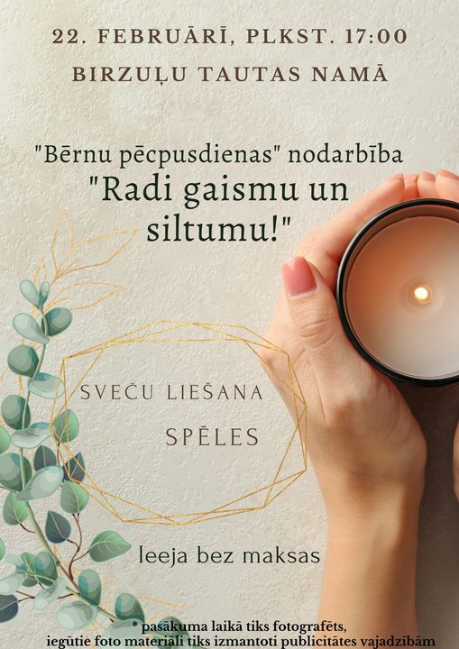 Kopā ar BIRZUĻU BIBLIOTĒKU aicinām 22.februārī plkst. 17.00 uz bērnu pēcpusdienas nodarbību “Radi gaismu un siltumu!”, kuras laikā būs iespēja izveidot savu gaismas un siltuma avotu – sveci!