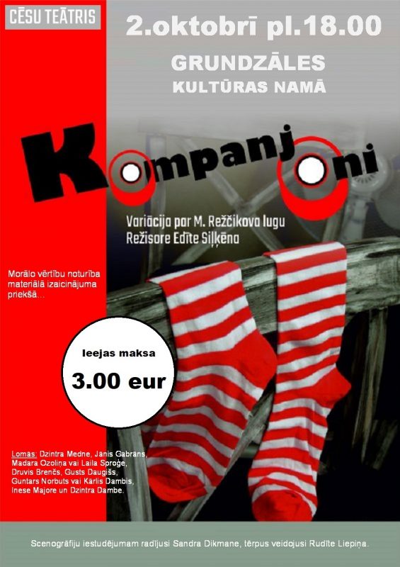 2.oktobrī plkst. 18.00 Grundzāles kultūras namā Cēsu teātra “Kompanjoni ” izrāde.