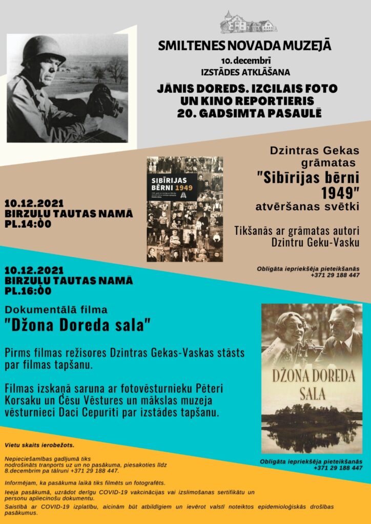 Savukārt, plkst. 16:00 Birzuļu tautas namā tiks demonstrēta Dzintras Gekas – Vaskas dokumentālā filma “Džona Doreda sala” izstādes “Jānis Doreds. Izcilais foto un kino reportieris 20. gadsimta pasaulē” atklāšanas ietvaros.