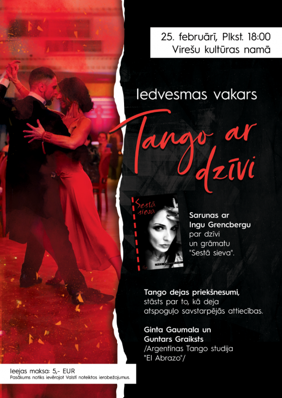 Vidagas bibliotēka sadarbībā ar Virešu kultūras namu 25.februārī plkst. 18.00 ielūdz uz iedvesmas vakaru “Tango ar dzīvi” Virešu kultūras namā. Pasākumā satikšanās ar grāmatas “Sestā sieva” autori Ingu Grencbergu. Sarunas par dzīvi un drosmi rakstīt un būt.