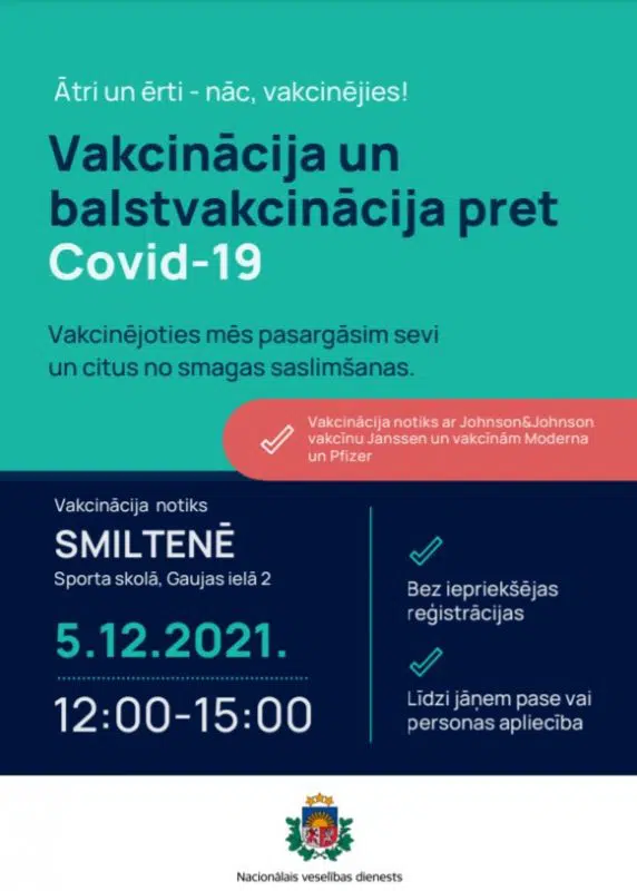 5. decembrī no 12.00. -15.00 notiks izbraukuma vakcinācija Smiltenē (Sporta skolā, Gaujas ielā 2).