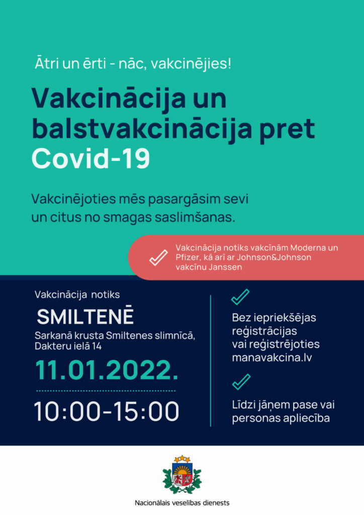 Izbraukuma vakcinācijā pret Covid-19, Smiltenē, Dakteru ielā 14 būs pieejamas “Moderna”, “Pfizer”, “Johnson & Johnson” vakcīnas.