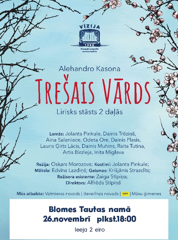 Alehandro Kasonas luga “Trešais vārds” Kauguru pagasta amatierteātra “Vīzija” iestudējumā ir lirisks stāsts par īstām, cilvēciskām jūtām – skumjām, alkām, sāpēm, viltu, dusmām, prieku, vilšanos, un pašu galveno – to, kas sirdīm liek pukstēt straujāk, kas maina cilvēkus un pasauli.
