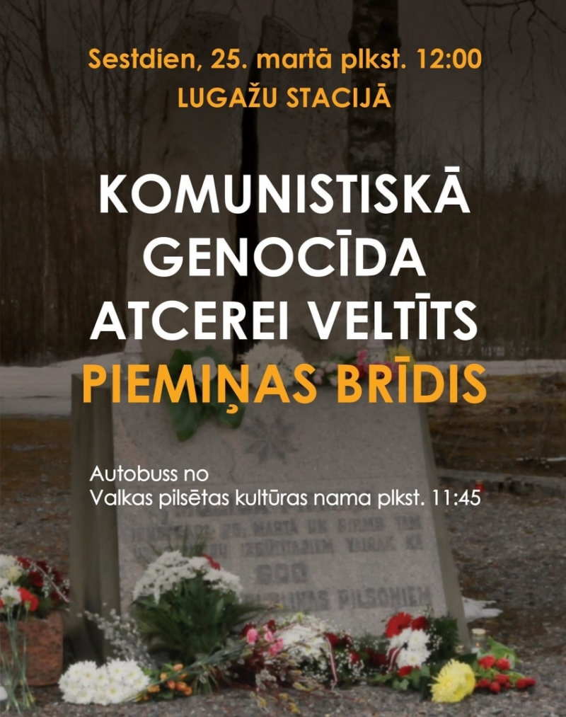 25.martā plkst. 12:00 Lugažu stacijā norisināsies Komunistiskā genocīda upuru piemiņas brīdis. Autobuss no Valkas pilsētas kultūras nama plkst. 11:45.