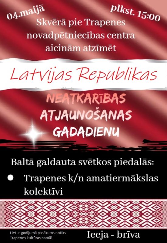 4.maijā plkst 15.00 Skvērā pie Trapenes novadpētniecības centra aicinām atzīmēt Latvijas Republikas neatkarības atjaunošanas gadadienu.