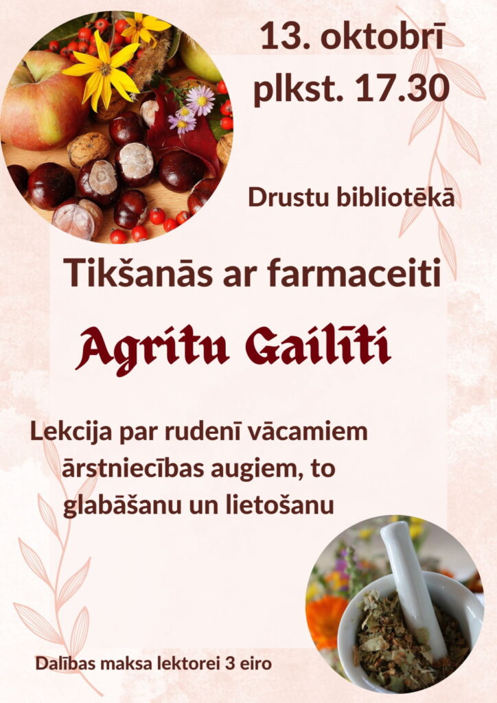 Ceturtdien, 13. oktobrī plkst. 17.30 Drustu bibliotēkā viesosies farmaceite Agrita Gailīte. Lektore dalīsies savā pieredzē par ārstniecības augiem, kurus var vākt rudenī, to glabāšanu un izmantošanu.