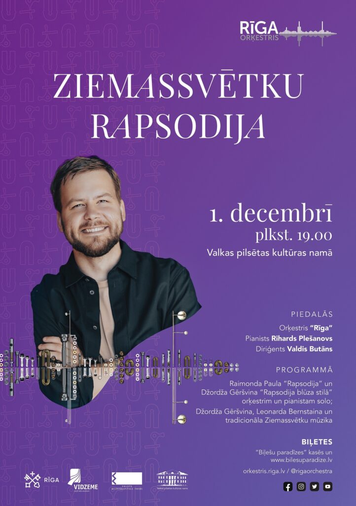 Piedalās: Orķestris “Rīga” Pianists Rihards Plešanovs Diriģents Valdis Butāns Koncerta vadītājs Raitis Zapackis Koncertprogramma ZIEMASSVĒTKU RAPSODIJA, ar kuru Orķestris “Rīga” viesosies Valkas pilsētas kultūras namā, caurstrāvos prieku un gaišumu, ar spožajām pūšaminstrumentu skaņām gaidot svētku laiku. Rapsodija – tas ir tematiski attīstīts skaņdarbs fantāzijas formā – un koncertā klausītāji varēs ļaut vaļu savai fantāzijai, klausoties divas rapsodijas – ikonisko Džordža Gēršvina “Rapsodiju blūza stilā” un retāk izskanējušo Raimonda Paula “Rapsodiju”. Programmas centrālais skaņdarbs ir latviešu mūzikas pērle – Raimonda Paula “Rapsodija”, kas redakcijā solo klavierēm un pūšaminstrumentu orķestrim izskanēs otro reizi. Komponists, sadarbībā ar aranžētāju Jāni Miltiņu, tikai 2023. gada sākumā deva iespēju un savu svētību “Rapsodijai” skanēt arī citu pianistu solistu izpildījumā, tādejādi, sniedzot iespēju šo skaņdarbu baudīt plašākam klausītāju lokam. Koncertā skanēs arī populārākās melodijas no Džordža Gēršvina operas “Porgijs un Besa” un Ziemassvētku laikam atbilstoša mūzika īpašos aranžējumos pūtēju koncertorķestrim. Šajā koncertā Orķestris “Rīga” uz sadarbību aicinājis pianistu Rihardu Plešanovu, kurš dzimis un sākotnēji skolojies turpat, Ziemeļvidzemē. 2022. gadā Riharda sniegums izcelts ar nomināciju Lielajai mūzikas balvai kategorijā “Par izcilu darbu ansamblī”. Šajā koncertā būs iespēja klausīties, kā ansamblī Plešanovs saspēlējas ar Orķestra “Rīga” mūziķiem. Ar stāstiem diriģenta izvēlēto mūziku rotās vakara vadītājs, muzikologs Raitis Zapackis. Koncertu atbalsta Vidzemes plānošanas reģions un Valsts kultūrkapitāla fonds. Koncerts top sadarbībā ar Valkas pilsētas kultūras namu.