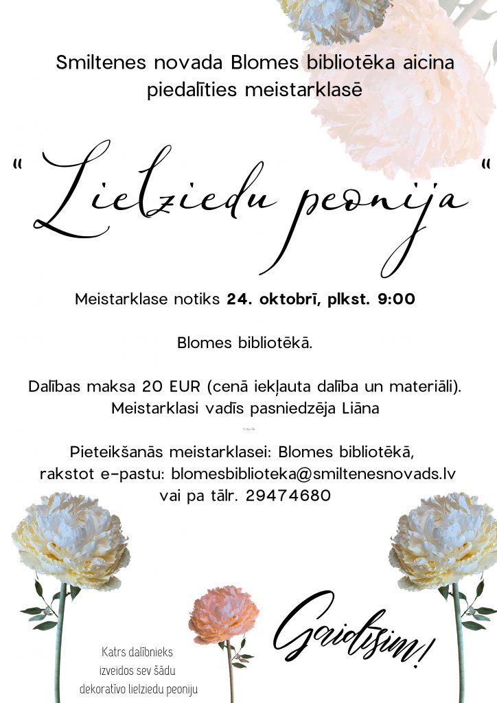 Blomes bibliotēka aicina radoši pavadīt 24.oktobra rītu, piedaloties meistarklasē “Lielziedu peonija”.