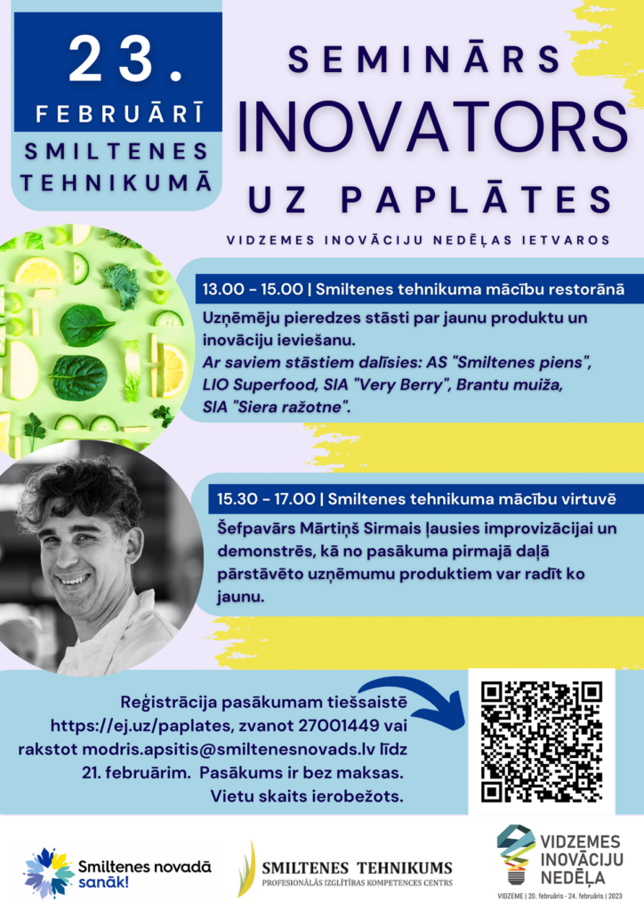 23.februārī no pulksten 13.00 Smiltenes tehnikumā norisināsies seminārs “Inovators uz paplātes” par inovācijām pārtikas nozarē Smiltenes novadā. Tajā gaidāmi aizraujoši vietējo uzņēmēju pieredzes stāsti, bet šefpavārs Mārtiņš Sirmais no novadā ražotajiem produktiem uzburs jaunus ēdienus. Pasākums tiek organizēts Vidzemes inovāciju nedēļas ietvaros.
