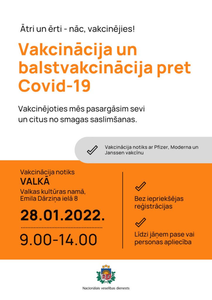 28.janvārī plkst. 9:00 – 14:00 Valkas kultūras namā, E.Dārziņa ielā 8, Valkā būs iespēja vakcinēties pret Covid-19.