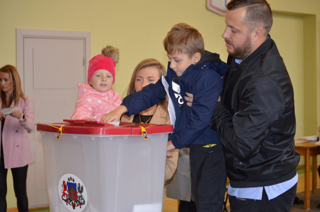 Smiltenes novadā savu izvēli 14. Saeimas vēlēšanās izdarīja 66,25 procenti no balsstiesīgajiem iedzīvotājiem. Iemest vēlēšanu urnā aploksni ar vēlēšanu zīmi smiltenieši Laura un Matīss Mežuļi uzticēja saviem bērniem, sešus gadus vecajam Paulam un trīs gadus vecajai Annijai. Foto: Sandra Pētersone