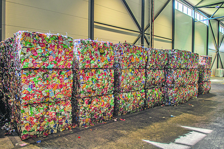 Gatavas promvešanai. Mēnesī no iepakojumu uzskaites un šķirošanas centra tiek izvestas 1400 tonnas pārstrādei paredzētā materiāla. PET un skārda iepakojumi tiek saspiesti un safasēti ķīpās. Apjomu dati liecina – ja visas sastrādātās ķīpas sakrautu vienu virs otras, sanāktu 3,6 kilometrus garš tornis.