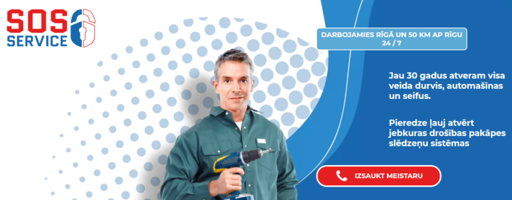 Atslēgu un slēdzeņu SOS serviss ,,LockService” piedāvā operatīvu palīdzību Rīgā un tās apkārtnē 7 dienas nedēļā cauru diennakti. ,,LockService” pakalpojumos ietilpst ne tikai durvju atvēršana, bet arī slēdzenes maiņa, auto atvēršana, seifu atvēršana, kā arī dažādu durvju remonts. ,,LockService” profesionāļu komandai ir 30 gadu pieredze šajā jomā, tāpēc sertificētajiem meistariem būs pa spēkam atvērt jebkura drošības līmeņa slēdzenes.