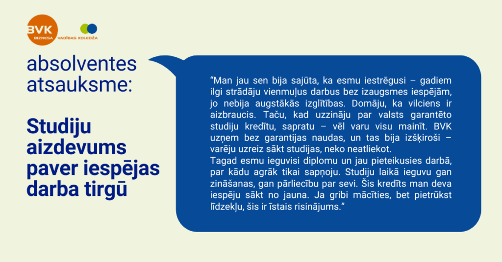 Laba izglītība ir panākumu atslēga uz labi apmaksātu darbu, tātad uz kvalitatīvu dzīvi. Diemžēl studēt gribētāju ir krietni vairāk par tiem, kas dodas studēt. Šāda situācija izveidojusies, jo sabiedrībā valda priekšstats, ka, lai studētu ir nepieciešami lieli iekrājumi, par kuriem segt studiju maksu. Mūsu apskatītās 5 iespējas, kur ņemt naudu studijām, pierāda, ka apmaksāt studijas var ļoti dažādos veidos, jāatrod tikai sev piemērotākais. Tāpēc aicinām uz Biznesa vadības koledžas atvērto durvju dienu online, kur tiks pastāstīts gan par studiju programmām, mācību procesu, piedāvātajām atlaidēm, gan kā norit studijas tālmācībā un būs iespēja uzdot visus sev interesējošos jautājumus.